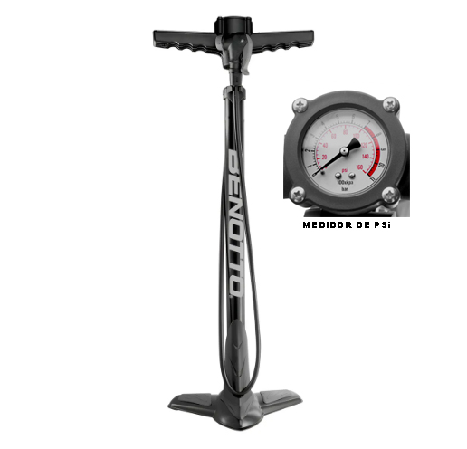 Bomba de piso con barómetro mismo que te ayudara a fijar las libras de presión necesarias en tus neumaticos, ya no ruedes bajito haciendo pesado tu viaje! con la Bomba benotto mantén siempre tus PSI correctos!